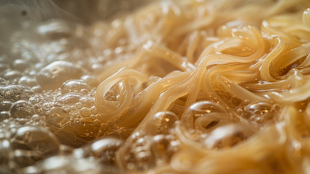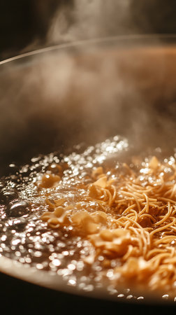 Extreme close-up of noodles immersed in boiling water, with steam and bubbles rising, highlighting the cooking process.