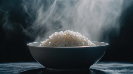 A mesmerizing close-up of steam rising from a bowl of cooking rice, capturing the warmth and simplicity of a traditional meal preparation.