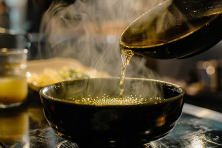 A person carefully pours steaming broth from a pot into a bowl placed on a stovetop, A bowl of steaming broth is carefully poured into a serving bowl, ready to be enjoyed