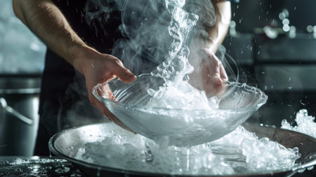 A high-speed capture of a water splash in a metal bowl, surrounded by dramatic lighting and mist, creating a dynamic and artistic composition.