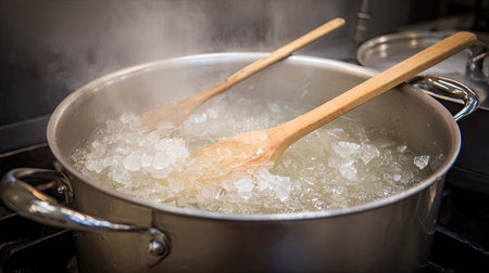 A stainless steel pot filled with boiling water and ice, featuring wooden spoons resting elegantly. Steam rises up, creating a dynamic kitchen scene.