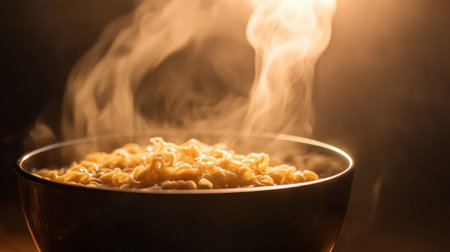 A steaming bowl of freshly cooked pasta exudes warmth and comfort, illuminated by a soft golden light. Ideal for culinary themes and food photography.