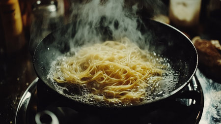 Black pan with spaghetti boiling, surrounded by ingredients, bubbles, and steam, capturing the essence of home cooking