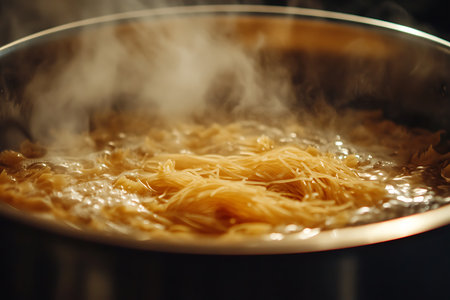 Close-up view of golden spaghetti cooking in a metal pot with boiling water and rising steam. Warm tones and detailed texture of noodles.