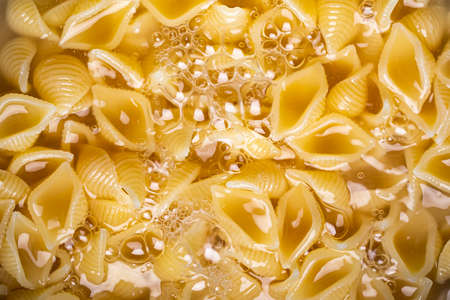 Italian pasta conchiglie cooked in a pan abstract backdrop. Traditional food. Texture.