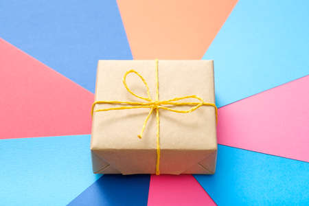 birthday present packed in a craft paper and tied with yellow twine. gift giving tradition and special reward concept.