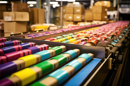 colorful labels on packages lined up on conveyor belt, created with generative ai