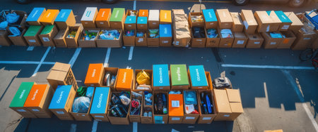 Aerial perspective of neatly arranged donation boxes with labeled categories such as clothes, toys, and books in a parking lot, symbolizing community charity efforts.
