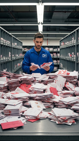 A focused, full body shot of a postal worker (mid-30s, male) sorting colossal stacks of Valentine's