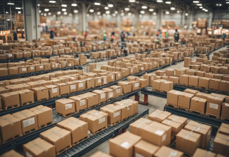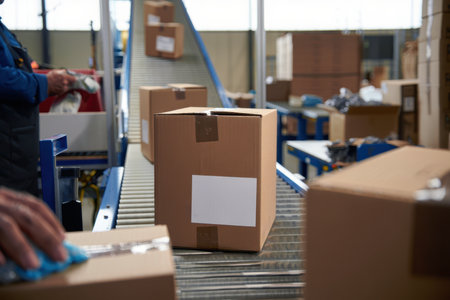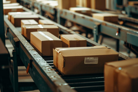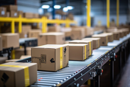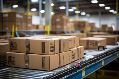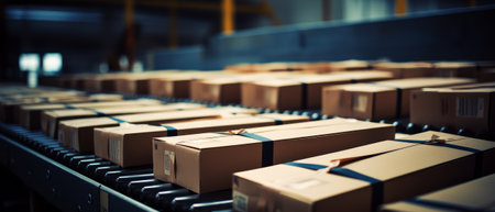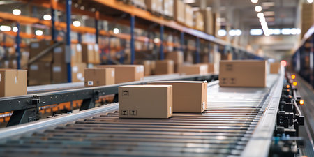 Cardboard boxes moving on a conveyor belt in a distribution warehouse, illustrating logistics and supply chain processes.