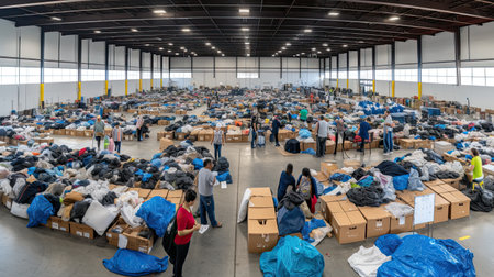 Volunteers Sorting and Packing Donations in a Warehouse for Charity Distribution.