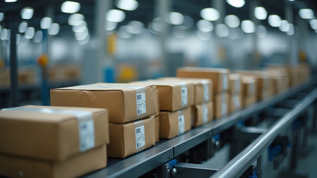 Conveyor belt with cardboard boxes in warehouse. Industrial background.