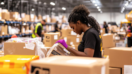 Workers efficiently sort packages in a busy warehouse setting showcasing streamlined logistics operations.
