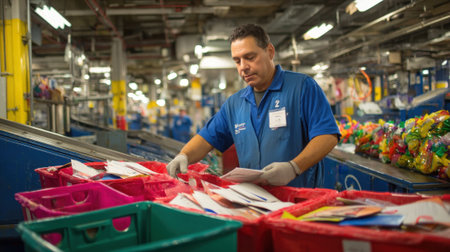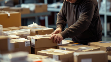 Medium shot of a worker sorting mailers made from recycled content focusing on the use of biodegradable and renewable resources in packaging production