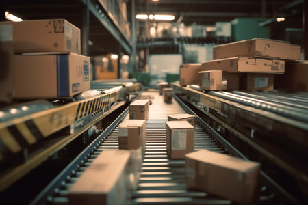 Cardboard boxes on conveyor belt in warehouse, focus on foreground, blurred background with shelves.
