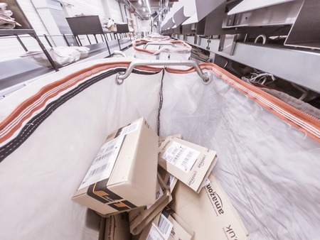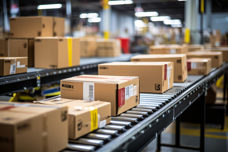Cardboard boxes moving on a conveyor belt in a distribution warehouse