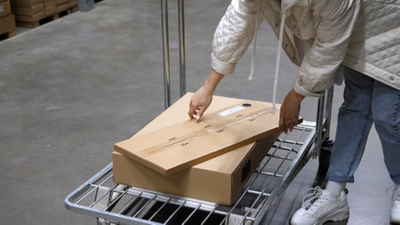 Young woman with shopping cart walking for choosing new furniture in big store warehouse and put some boxes in trolley