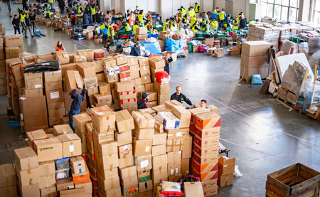 POZNAN, POL - MAR 12, 2022: Humanitarian aid for Ukraine organized by civil society in Poland after Russian invasion on Ukraine in 2022
