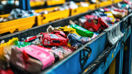 A vibrant view of assorted packages on a conveyor belt, highlighting the sorting process in a busy warehouse environment for logistics and distribution.