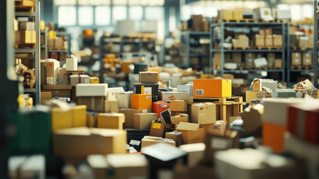 Wide shot of a large warehouse area cluttered with various parcel boxes, illustrating the growth of e-commerce