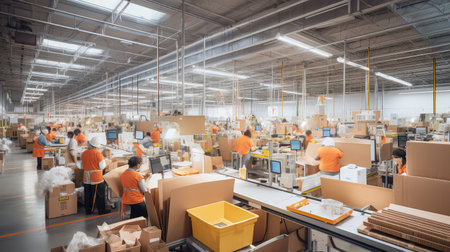 Packed courier on production line against cardboard boxes in warehouse Generative AI
