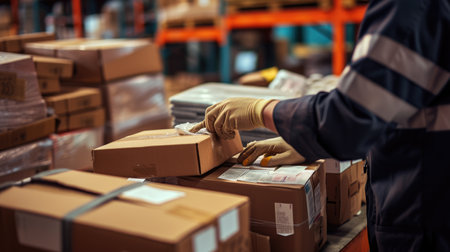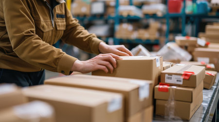A logistics worker places fragile stickers on cardboard boxes in a bustling warehouse. Shelving units and parcels are visible, with soft natural lighting creating a clean, commercial feel.