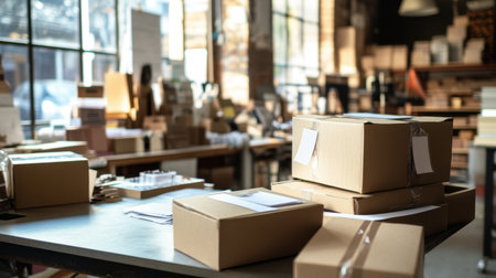 An inviting workspace featuring neatly stacked cardboard boxes on a table. The bright ambiance enhances the productive atmosphere, perfect for packaging and shipping tasks.