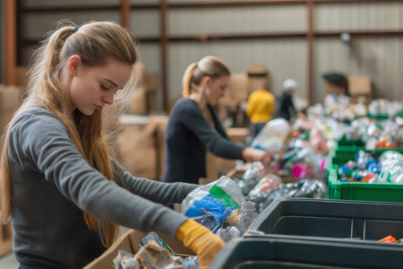 Volunteers sorting plastic bottles and other recyclable materials in containers at a recycling center