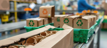 Sustainable Packaging Station A modern warehouse section dedicated to eco-friendly packaging, featuring biodegradable materials and minimal waste processes. Workers carefully