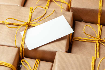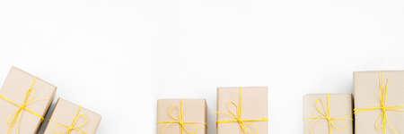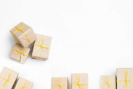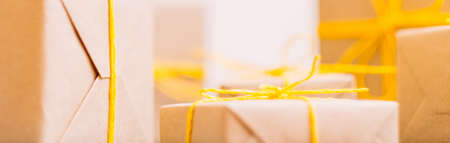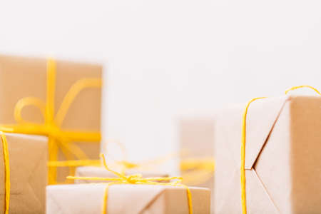 festive holiday gift box background. presents wrapped in craft paper tied with yellow twine on white defocused backdrop.