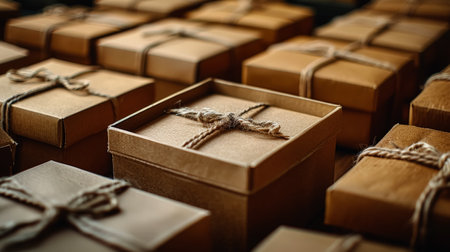 A stack of rustic brown paper packages tied with twine, creating a cozy and nostalgic feel, perfect for holiday or vintage themes.