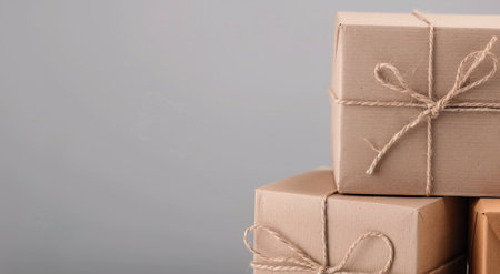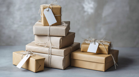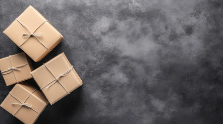 This image features four neatly wrapped gift boxes tied with twine, set against a textured gray background. Ideal for holiday themes or gifting concepts.