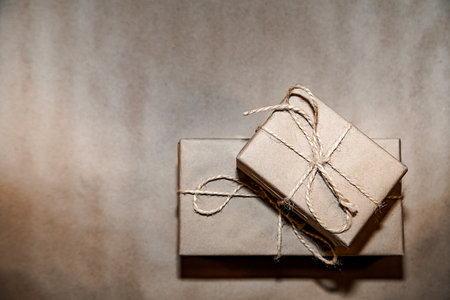 two gift package wrapped with plain brown paper and rope and brown paper background texture, retro gift box. present concept