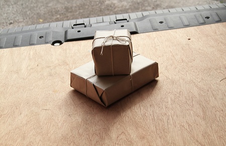 two parcels on the back of a van ready to be delivered to the door of the customer. Image is shot from within the van looking out