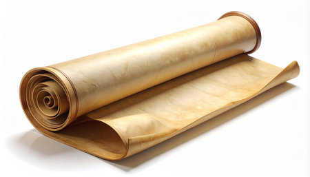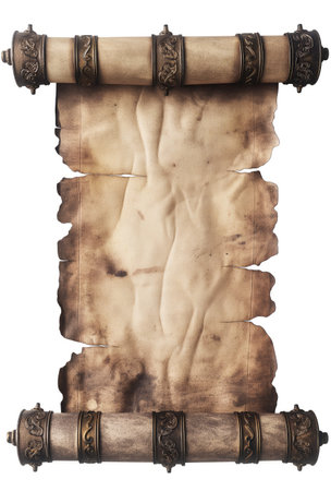 This captivating image features ancient scrolls with intricate designs, resting gracefully on a clean white background. Perfect for historical themes.