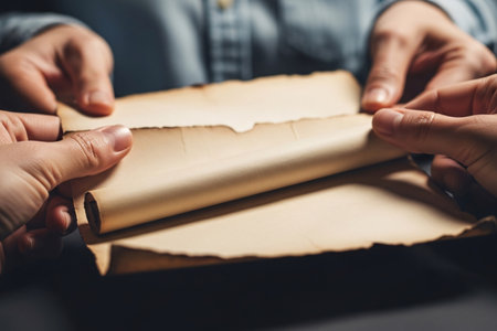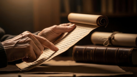 Close up of hands gently unrolling an antique handwritten correspondence carefully preserved like a scroll showing memory and sentiment.