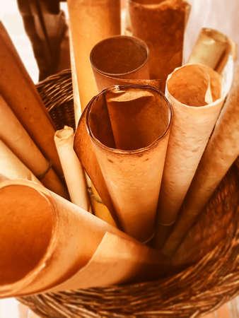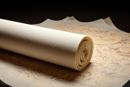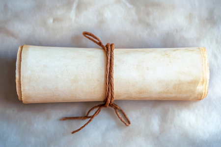 Ancient Scroll Fragment - A delicate piece of rolled parchment paper with authentic aging characteristics.
