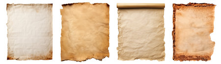 Collection set of vintage aged paper scroll parchment, old texture torn burnt crumple rip edges on white background cutout file. Many different design. Mockup template artwork