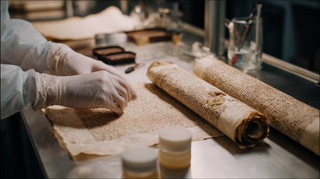 First-Person View of Hands Unrolling Ancient Parchment in Lab Setting