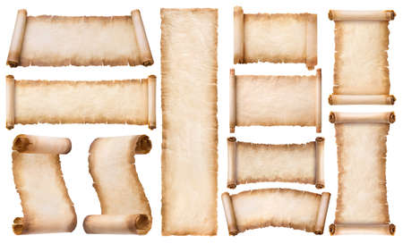 collection set old parchment paper scroll sheet vintage aged or texture isolated on white background.