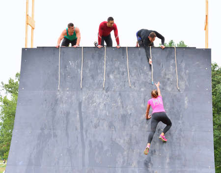 Group of participants in an obstacle course climbing a drum helped by their teammates