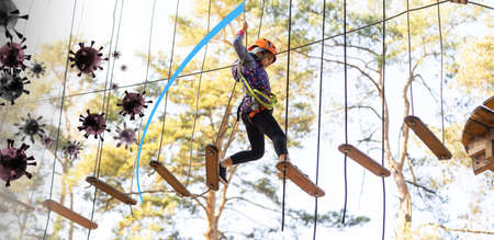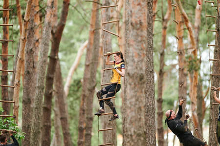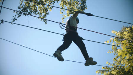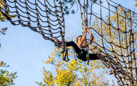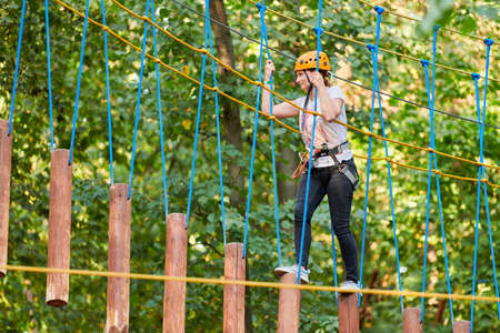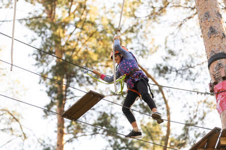 Voronezh, Russia - 24.08.2019 - Girl in high ropes experience adventure tree park. Rope road course in trees. Climbing adventure rope park. Wood bridge and high wire activity.