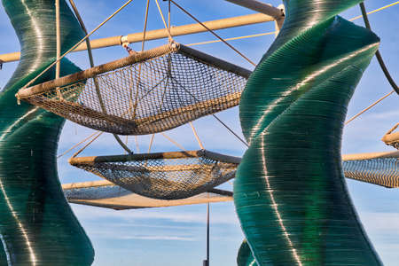 Ropes fastened together on the playground, in the open air, against the background of a blue sky. Part of the play equipment. Abstract background.