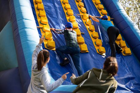 Group of enthusiastic men and women passing obstacles and having fun on inflatable arena at amusement park