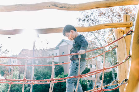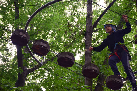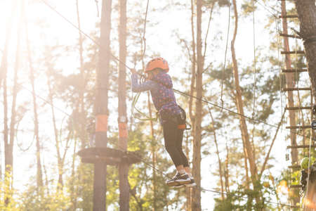 School boy in forest adventure park. Acitve child, kid in helmet climbs on high rope trail. Agility skills and climbing outdoor amusement center for children. Outdoors activity for kid and families.