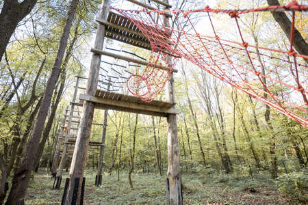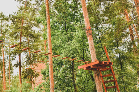Rope adventure park in fir tree forest. Scenic view. Summer outdoor sports and leisure activities