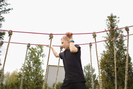 the boy goes through an obstacle course, goes in for active sports, walks on a cable car
