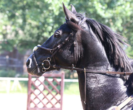Head shot portrait close up of a beautiful sport horse on show jumping event. Side view head shot of a showjumper horse on natural background