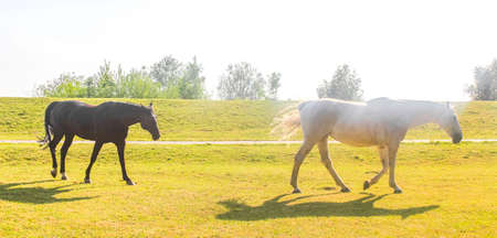 A gray horse standing beside a bay horse under the sunny summer sky, depicting the world of equestrian sports. Horse breeding, the beauty of horses, animal sports, horsemanship and agriculture.