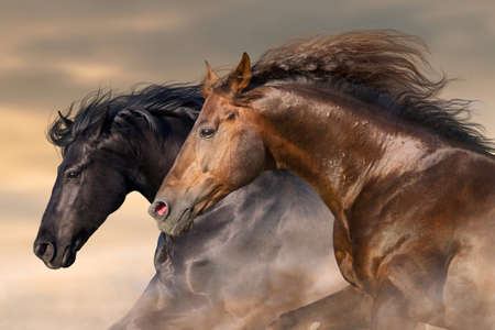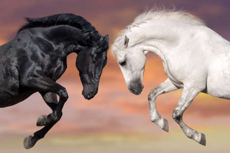 Portrait of two Andalusian horses in motion on sky background. Selective focus on white horse.